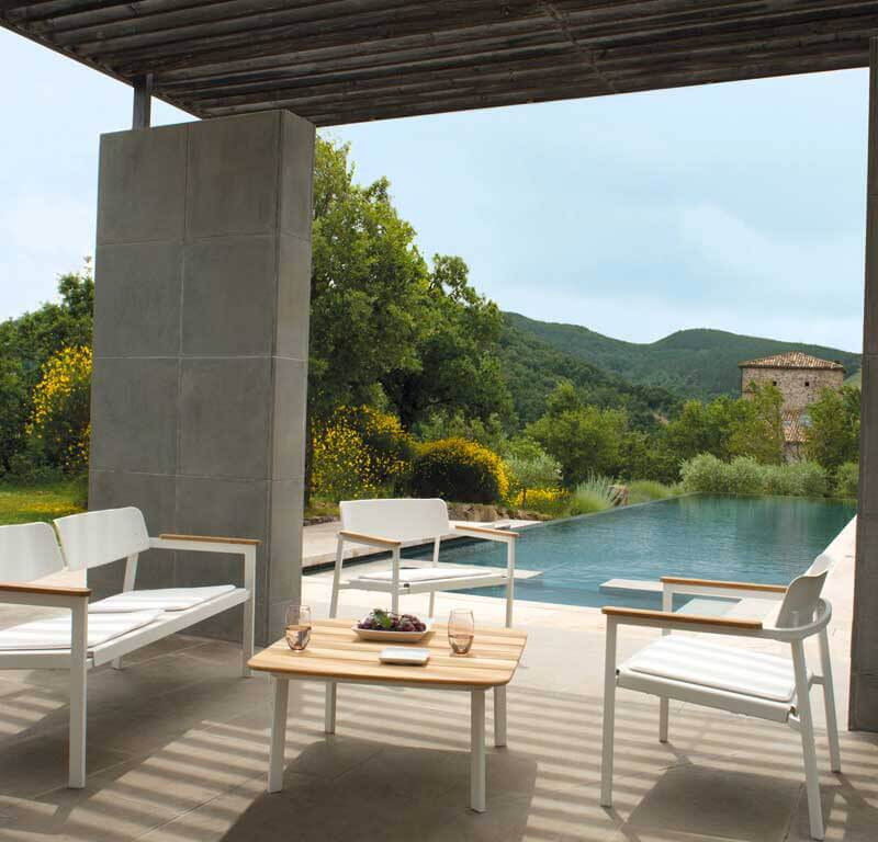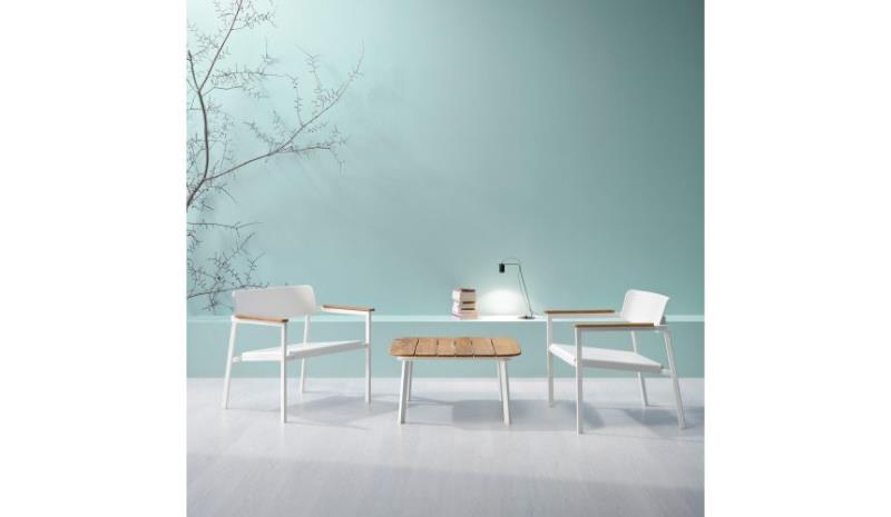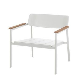 This elegant aluminum garden armchair is both lightweight and weatherproof. It is part of the beautiful collection "Shine" which blends beautifully metal and wood. A collection that invites to relaxation.