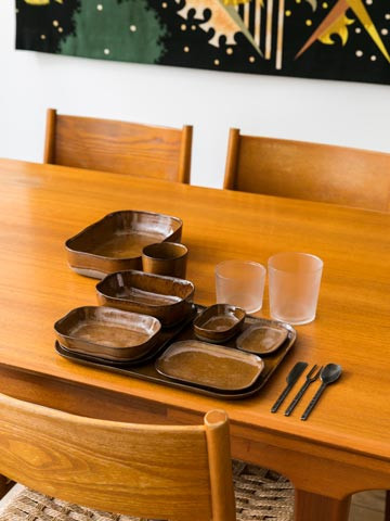 The tableware "the new table" also responds to the more nomadic modes of fooding: in the sofa, in front of his desk or on the bed. The trays integrate with each other, taking up less space and adapting easily to different environments.