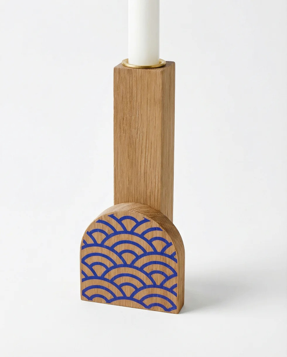 Pensés comme de véritables objets décoratifs, les bougeoirs "Voute" marient la noblesse du bois français à des motifs vibrants inspirés des arts décoratifs : ondulations japonisantes (Écaille), lignes graphiques affirmées (Rayé) ou esprit rétro assumé (Sixties). Leur bobèche en aluminium doré vient sublimer l’ensemble d’une touche élégante et contemporaine.