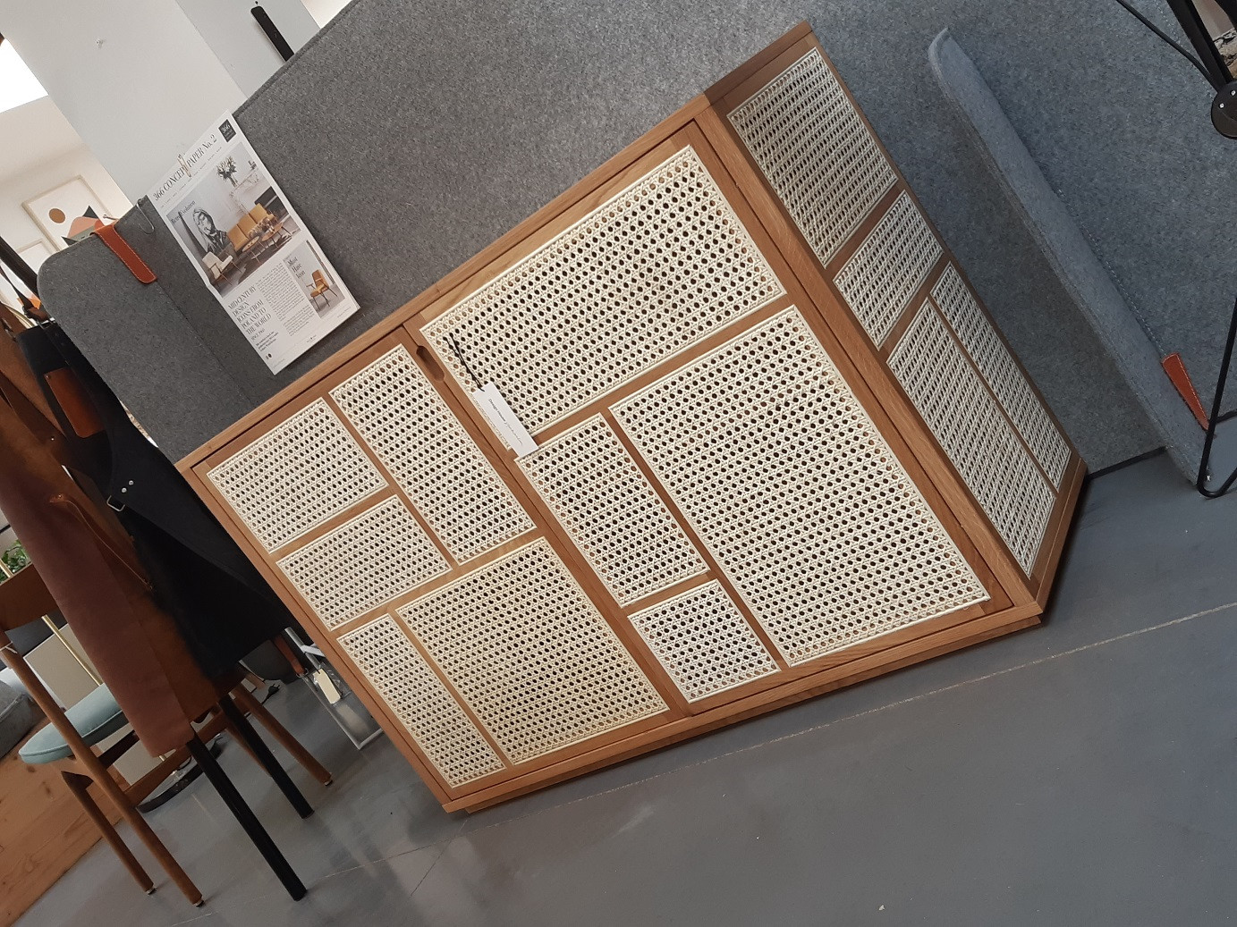Mathieu Gustafsson est fasciné depuis sa prime enfance par le canage. Pour sublimer ce matériau, il a prévu un passe-câble à l'arrière du buffet. Ceci permet d'y placer une petite lampe sur pied pour amplifier l'effet ajouré.