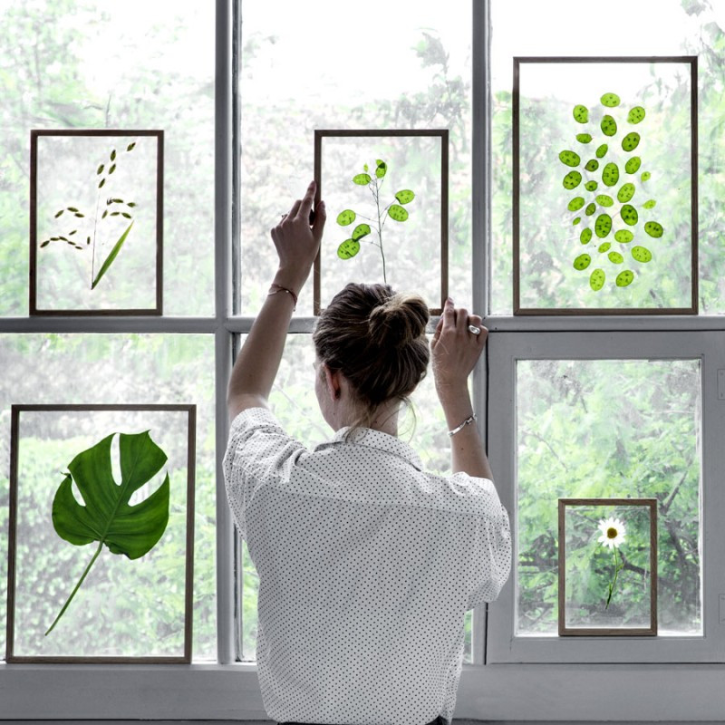 Entre les deux feuilles de verre acrylique, on insère des feuilles séchées, une photo ou une affiche.
