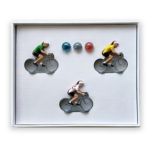 Le coffret Tour de France est composé de 3 cyclistes (maillot jaune, vert et à pois), ainsi que de 3 billes.
