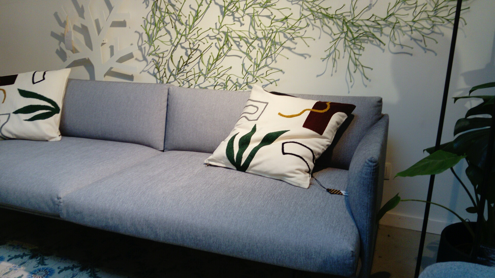 De magnifiques formes abstraites sont brodées sur les coussins pour le plus grand plaisir des yeux.