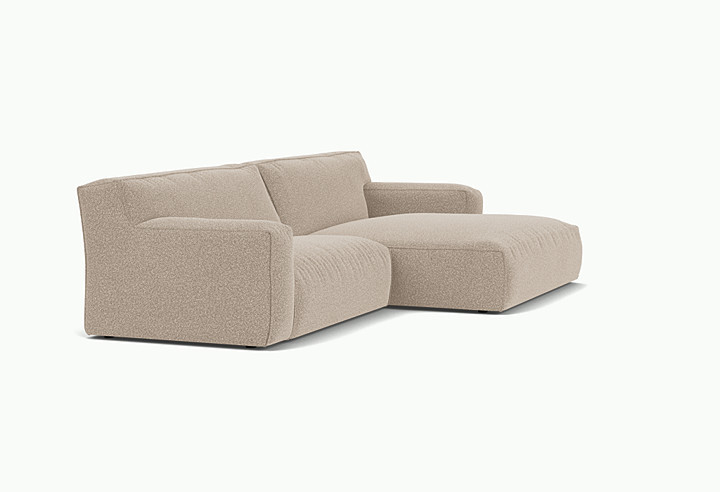 Nous proposons une version composée de 2 modules: module 1,5 place et module chaise longue (à gauche ou à droite). Mais il y a de nombreuses autres compositions possibles. De même, nous avons choisi le tissu alpine beige, mais ce n'est qu'un choix parmi d'autres.