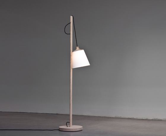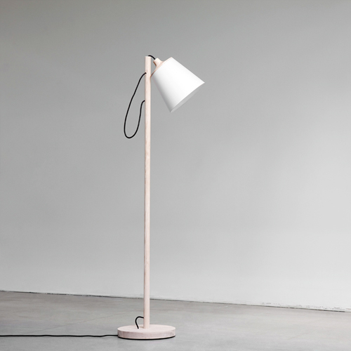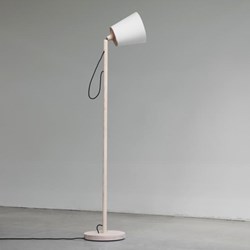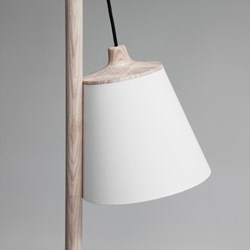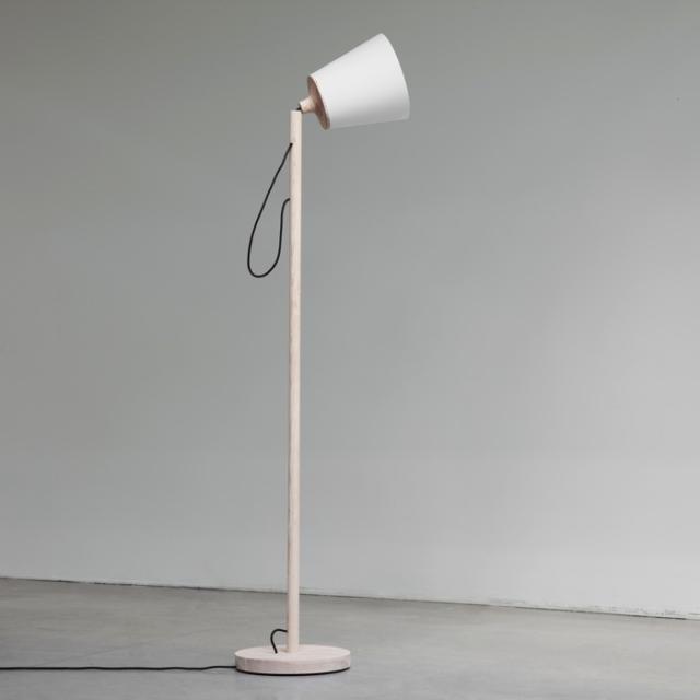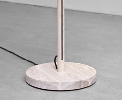 Lampadaire en frêne épuré et pratique qui s'inscrit dans la plus pure tradition du design scandinave. L'abat-jour est amovible par simple traction sur le fil électrique. On peut ainsi jouer avec cette lampe en lui donnant une apparence différente.