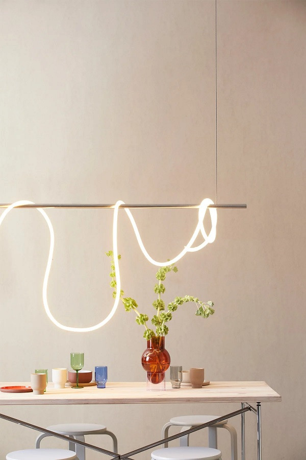 Flex Tube mesure 5 ou 9 mètres de long et a une couleur blanc chaud qui procure une lueur agréable dans la pièce. Il a été conçu par Mikkel Lang Mikkelsen du Studio About.