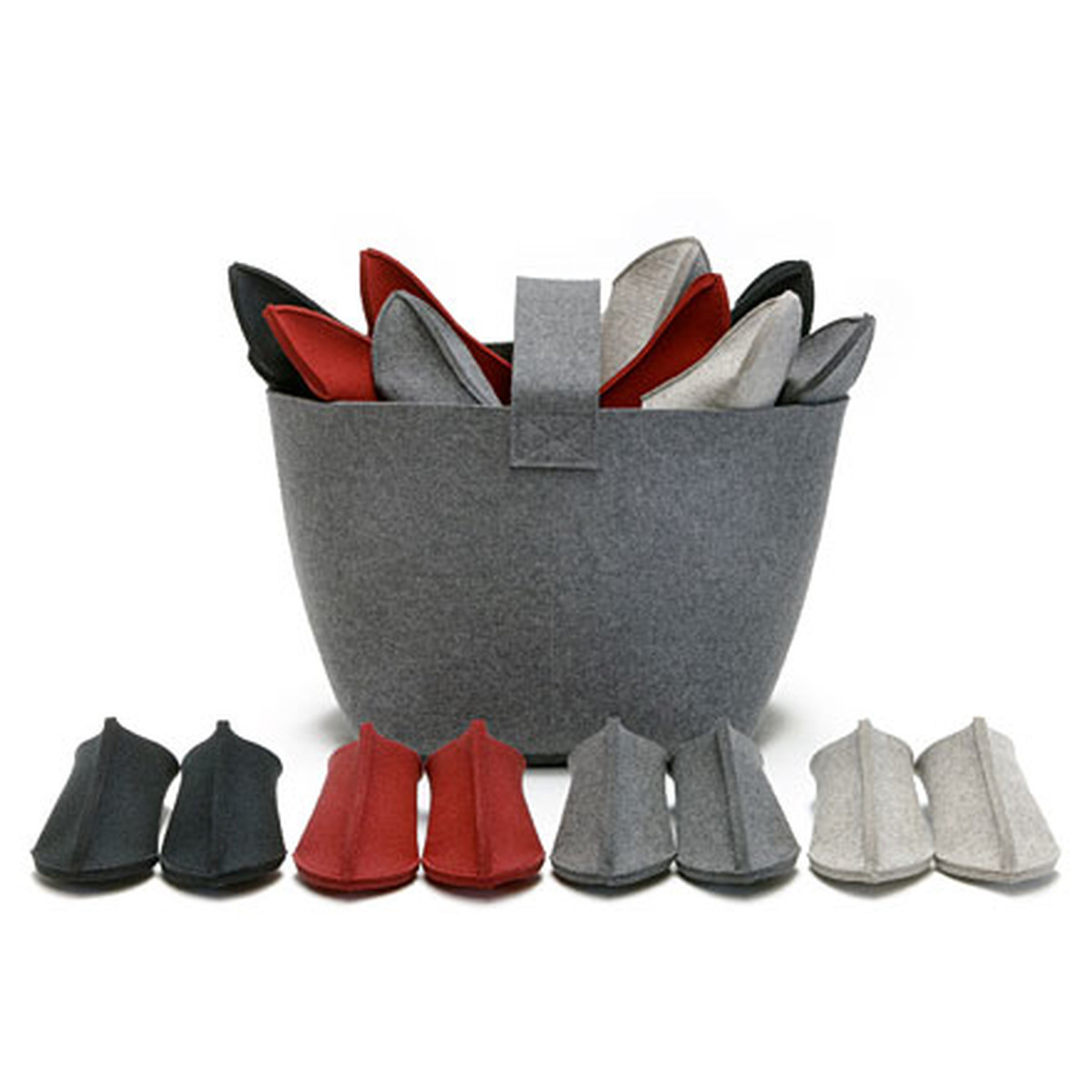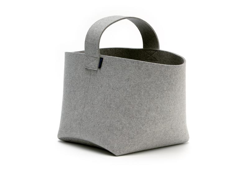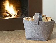 Panier à bûches (ou revues) en feutre élégant et chaleureux. On le déplace au moyen de sa anse et on le dispose dans le salon pour un très bel effet.