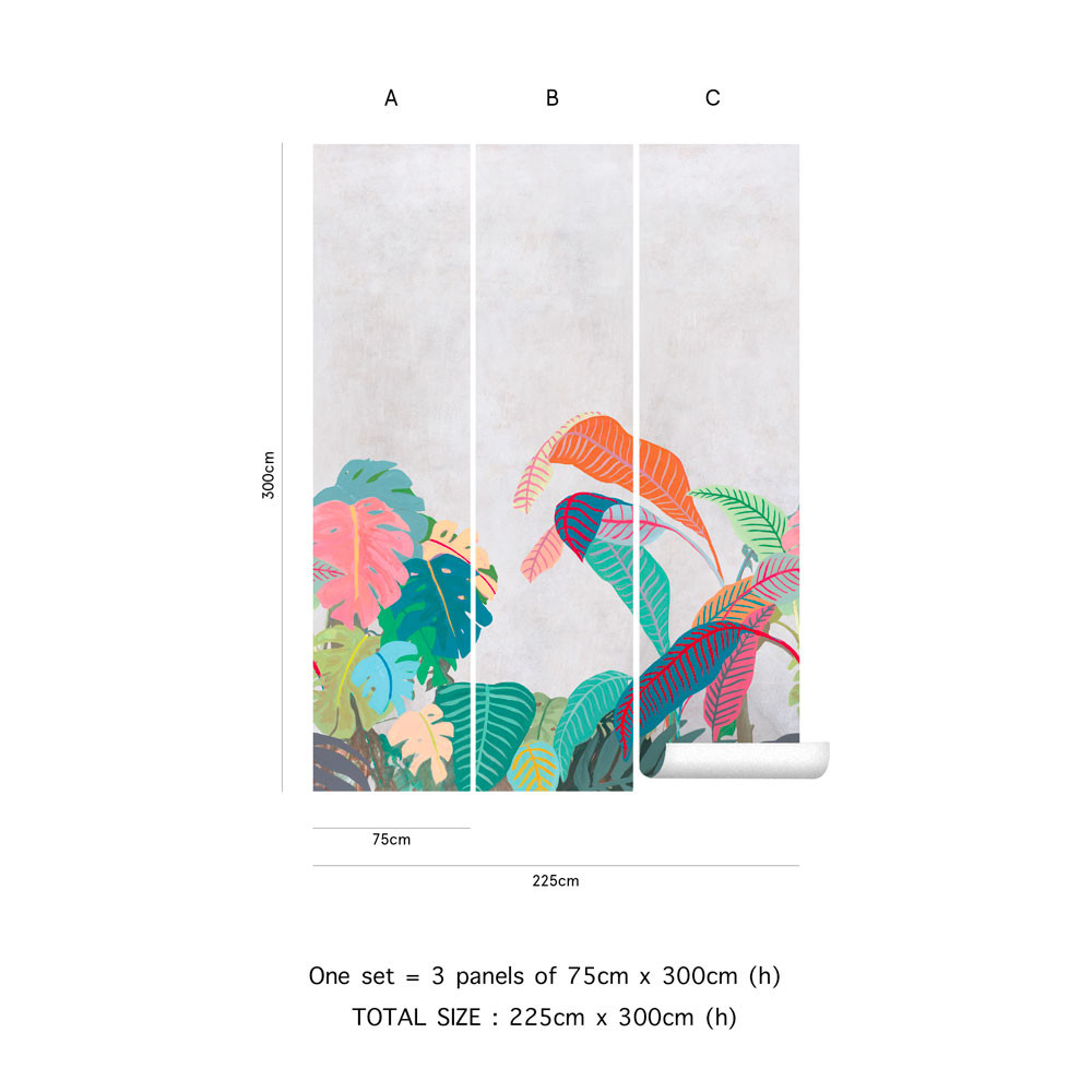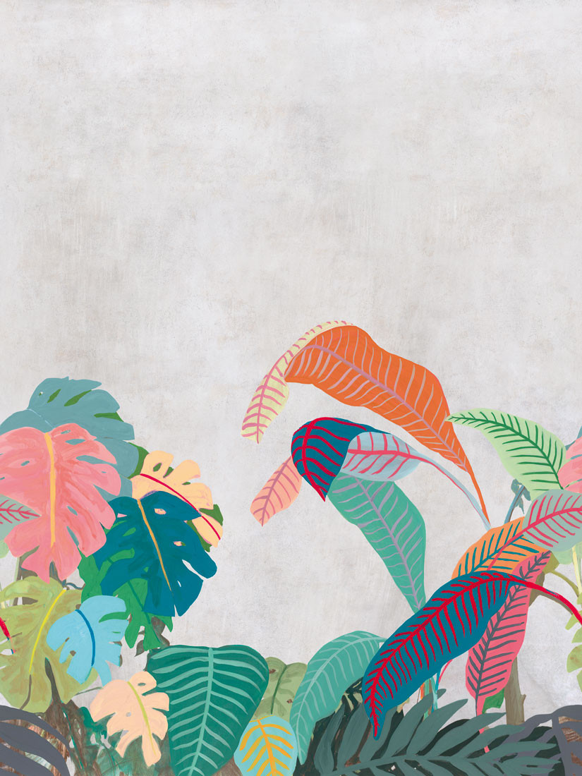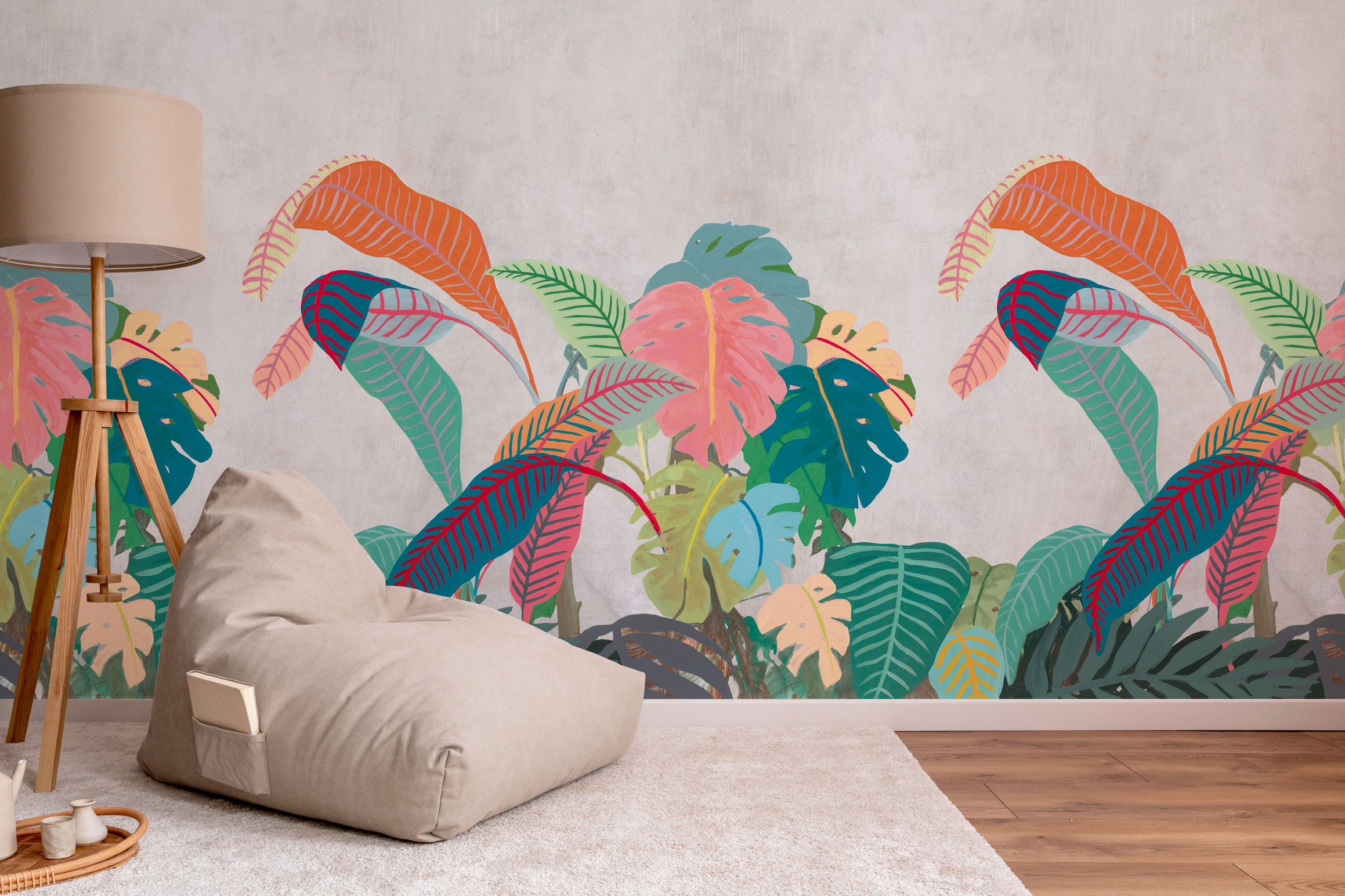 Le thème de la Jungle est à l’honneur dans cette fresque aux feuillages tropicaux et colorés.