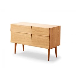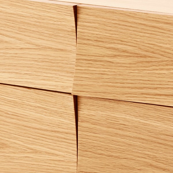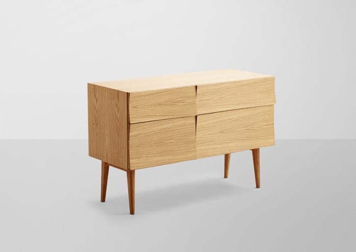 Le buffet "reflect" (version étroite) se singularise par les courbures qui apparaissent aux coins de chaque porte et tiroir.