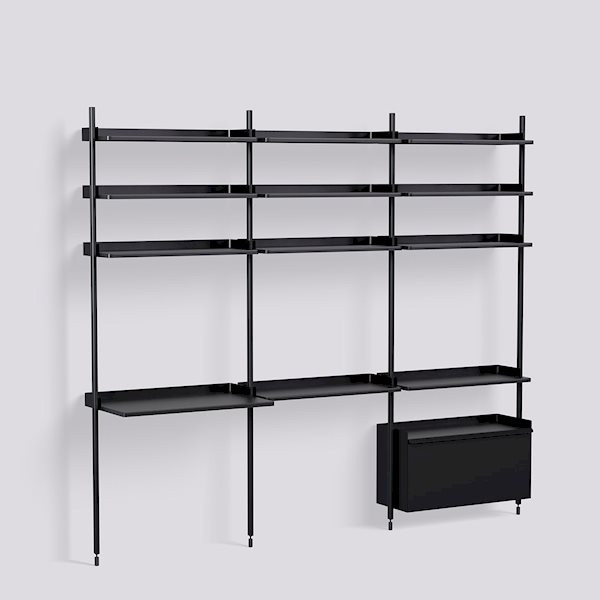Pier System est disponible dans une variété de couleurs et de configurations. Nous proposons une configuration (avec 3 colonnes, 11 étagères, 1 bureau et 1 armoire), d'autres configurations étant possibles selon vos besoins et envies.