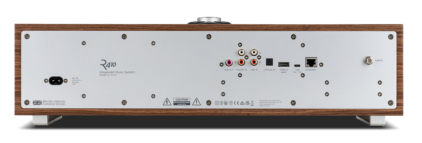 La "R410" affiche les connectiques nécessaires au branchement d’une platine vinyle ou d'une TV.