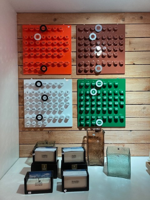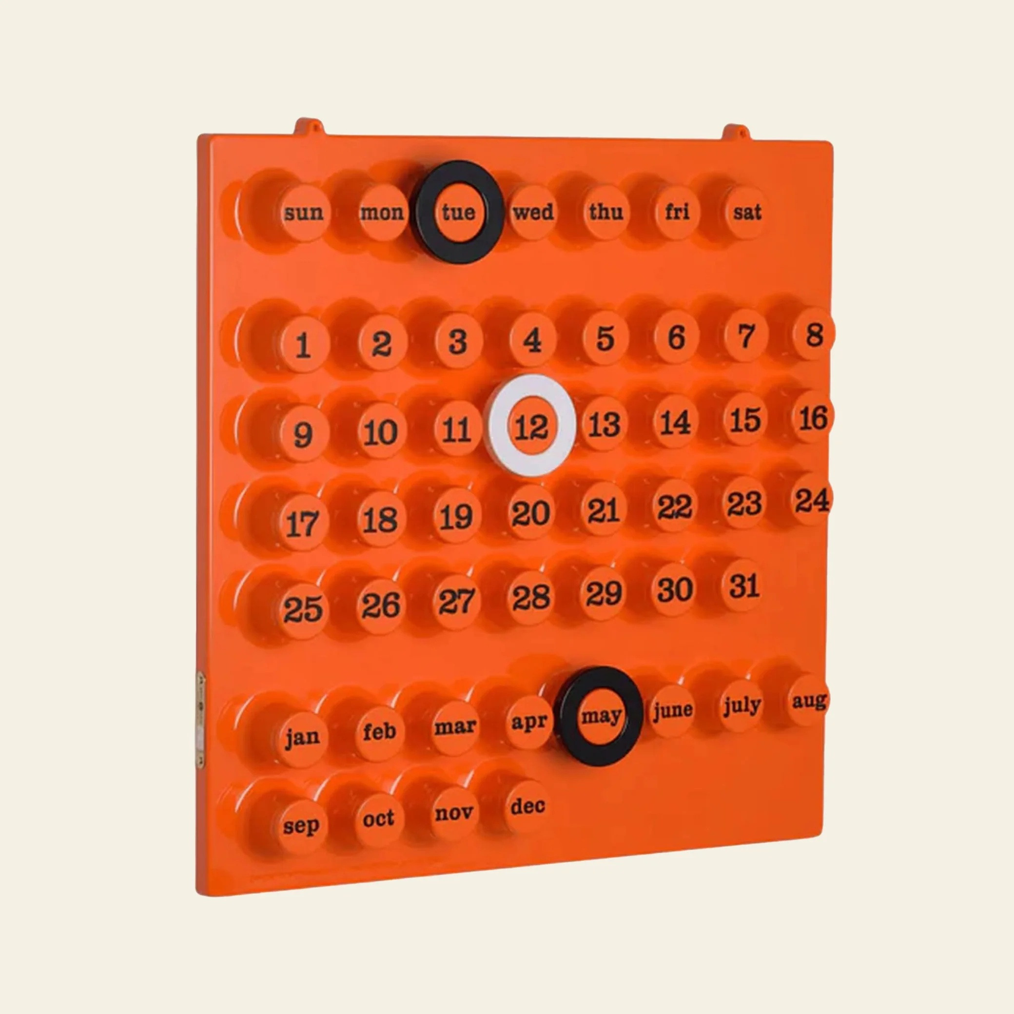 Réalisé en plastique ABS, il allie légèreté, durabilité et une finition impeccablement italienne. Chaque jour, on déplace les anneaux colorés pour marquer la date — un geste simple, presque poétique, qui relie fonctionnalité et plaisir visuel.