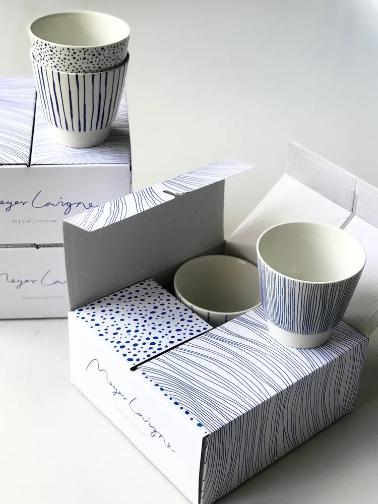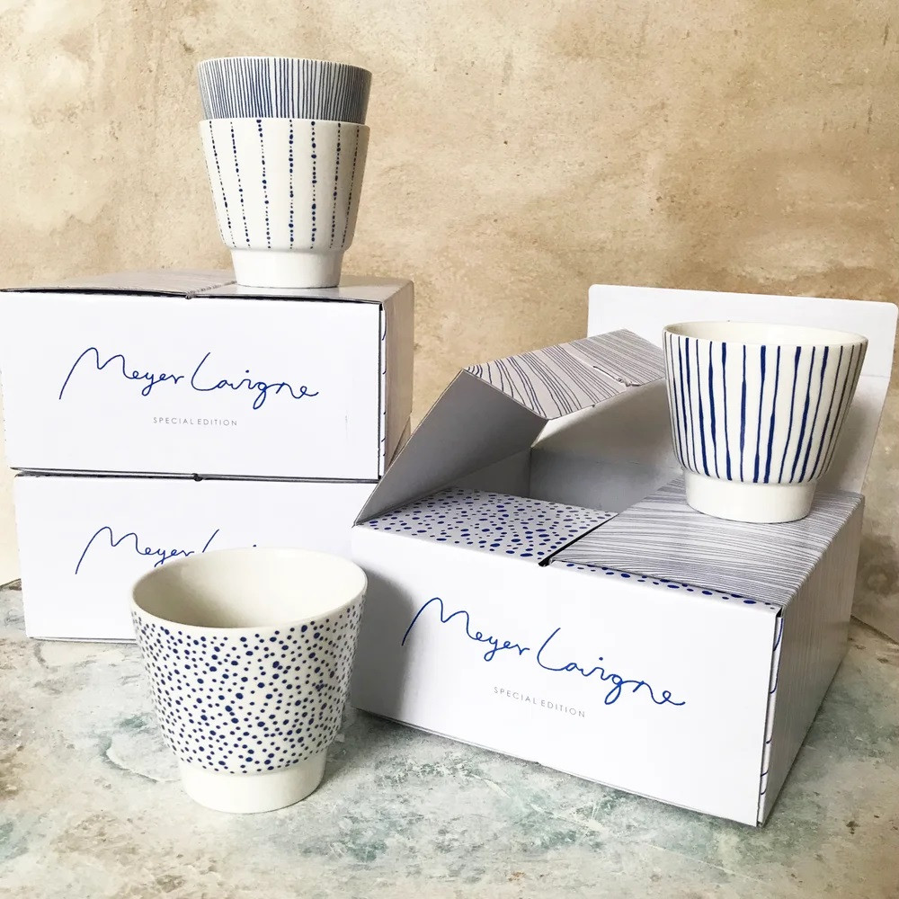 Les 4 tasses sont présentées dans un coffret-cadeau au design poétique, créé par Meyer-Lavigne. Les tasses peuvent aller au lave-vaisselle, mais les décalcomanies en céramique finiront par perdre une partie de leur intensité de couleur. Nous conseillons donc de les laver à la main.