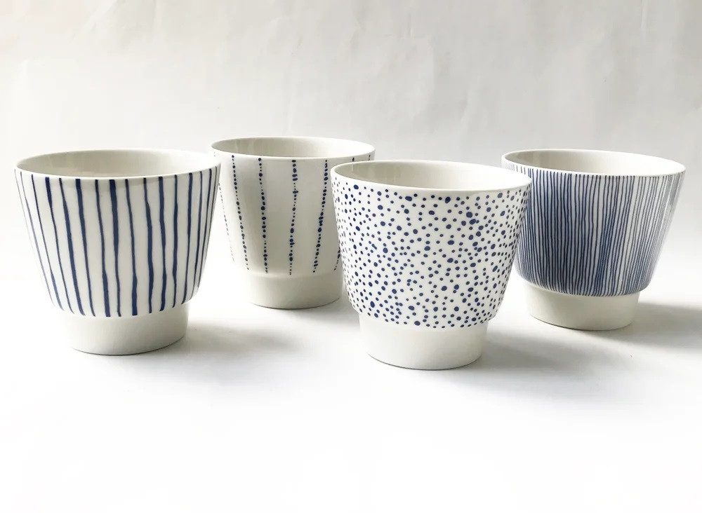 Cette édition spéciale des "blue cups" a la particularité de proposer des tasses en porcelaine ornées de dessins faits à la main puis apposés par décalcomanie.