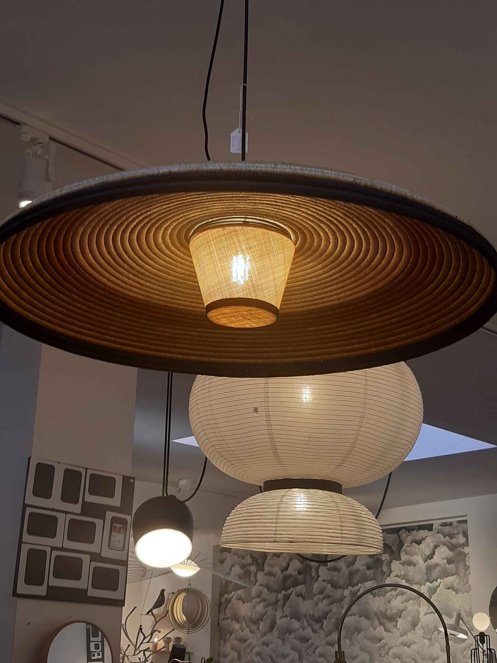Superbe suspension en fil d'abaca proposée par la marque de luminaires française Forestier.