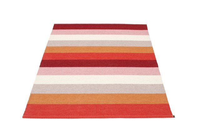Tapis tissé issu de la tradition suédoise. Pappelina a su redonner vie à ces merveilleux tapis en introduisant un nouveau matériau (plastique), des couleurs vives et un graphisme moderne.