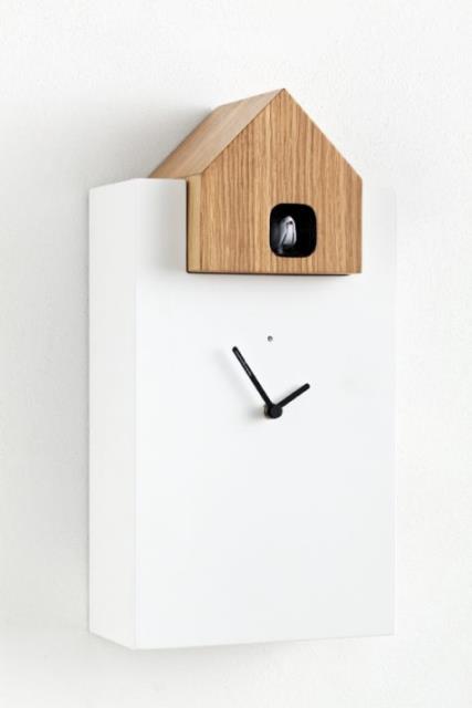 De Ettore klok Ettore onderscheidt zich door zijn originele vorm: een vogelhuisje herbergt de koekoek ingekapseld in een grotere doos. Het spel van materialen is ook interessant en brengt een dynamiek aan het geheel.