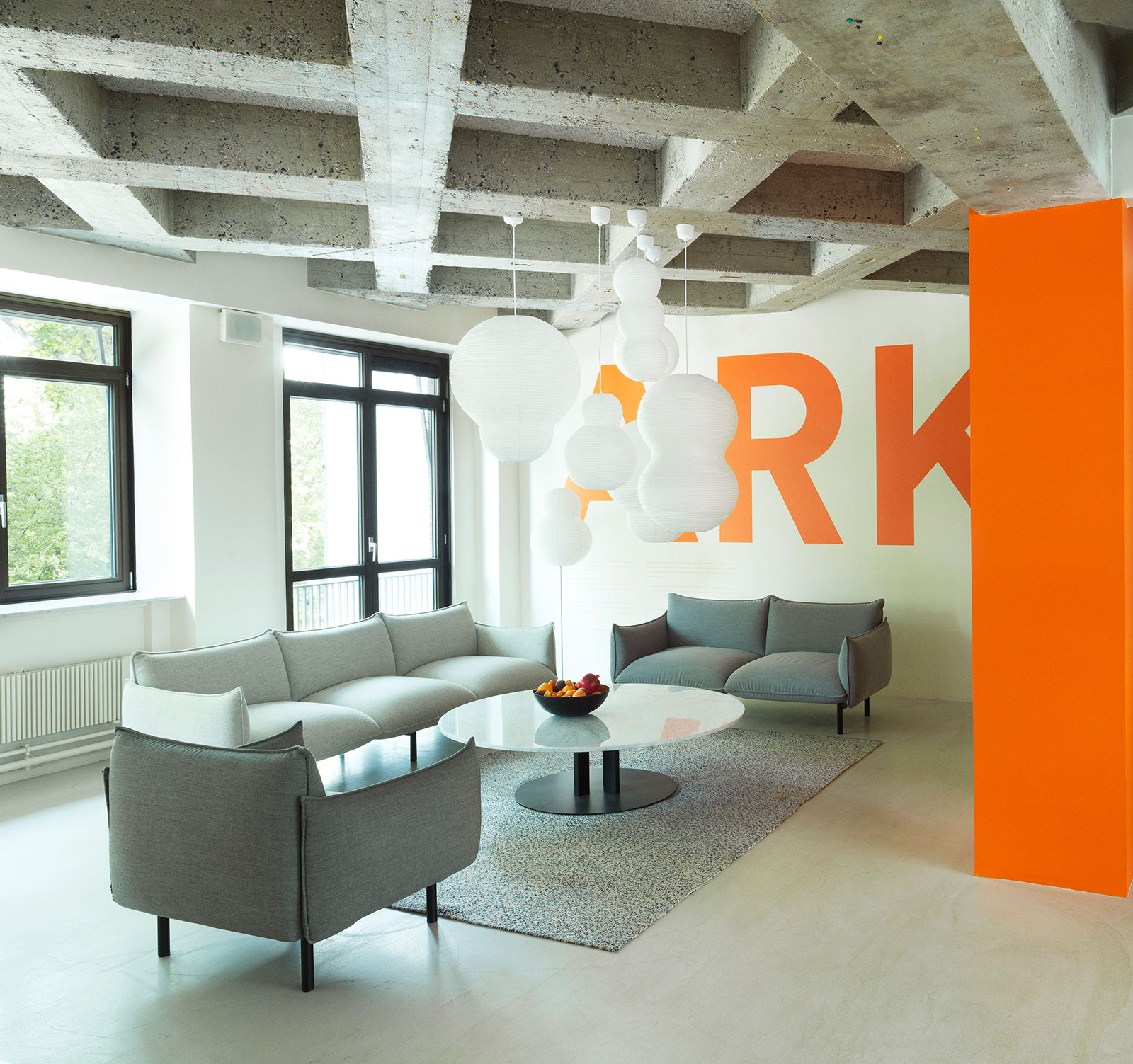 De bank Ark heeft gebogen vormen met dikke kussens die op een luchtige basis rusten. Het wordt bekroond door de Puff rijstpapiersuspensies met een genereus ontwerp. Deze lampen van verschillende vormen zijn op verschillende hoogtes geplaatst voor een zeer succesvol clustereffect.
